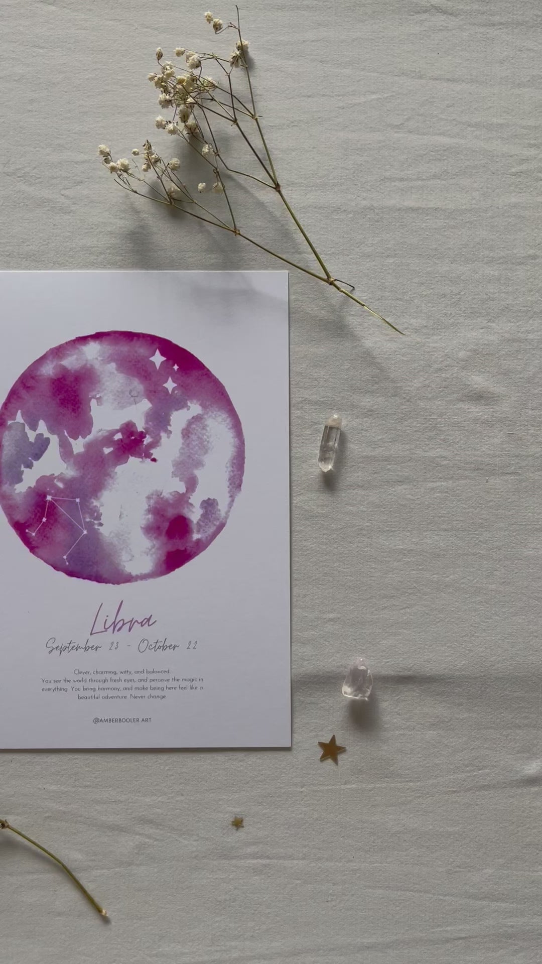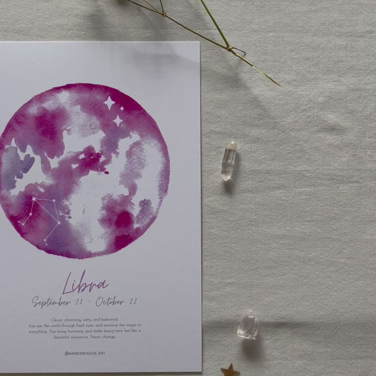 Print of an original watercolour artwork by me, featuring sign colours, star constellation, dates, characteristics and a message to the sign underneath.