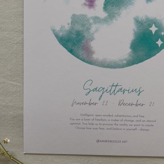 Print of an original watercolour artwork by me, featuring sign colours, star constellation, dates, characteristics and a message to the sign underneath.